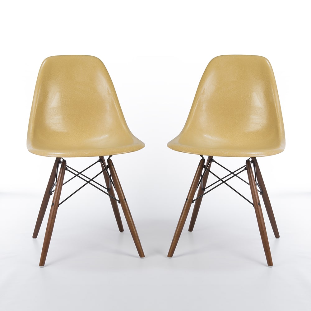 Login to ask a questionThese gorgeous, vintage original light ochre Eames side shells for Herman Miller on newer, used DSW bases really are great versions of the iconic shell chairs. The distinctive colour has not been marred by time and sat on the walnut dowel bases these chairs work perfectly as living or dining chairs.
