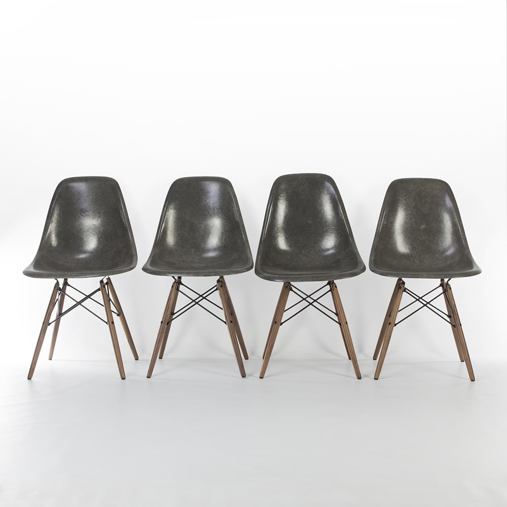 Login to ask a questionOne of the original six colours, a set of 4 gorgeous elephant grey Herman Miller Eames dining side chairs look resplendent on their walnut ‘DSW’ dowel bases. A design that has truly stood the test of time, the Eames’s ‘chair for the people’ really has lived up to this legacy and this gorgeous set does just that.