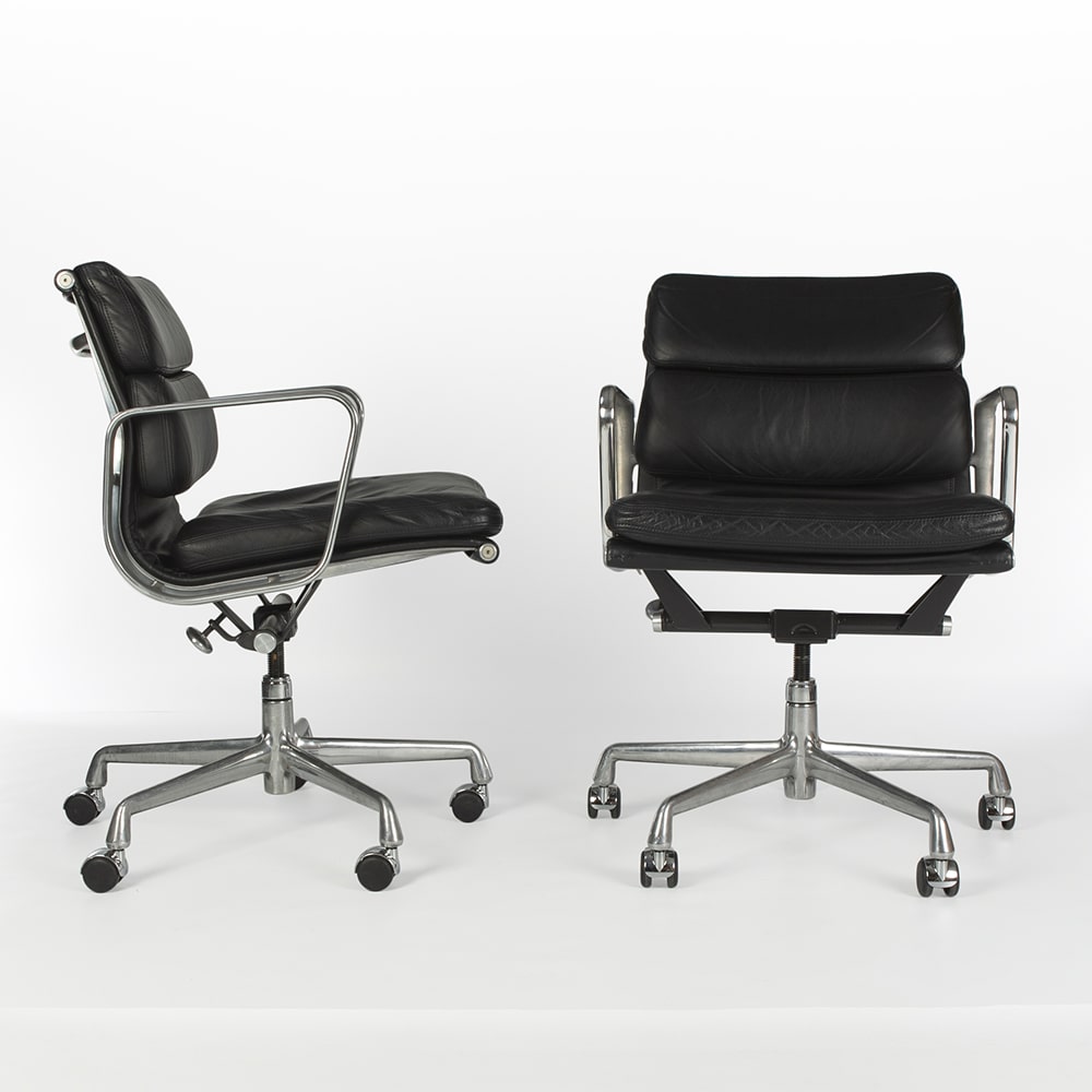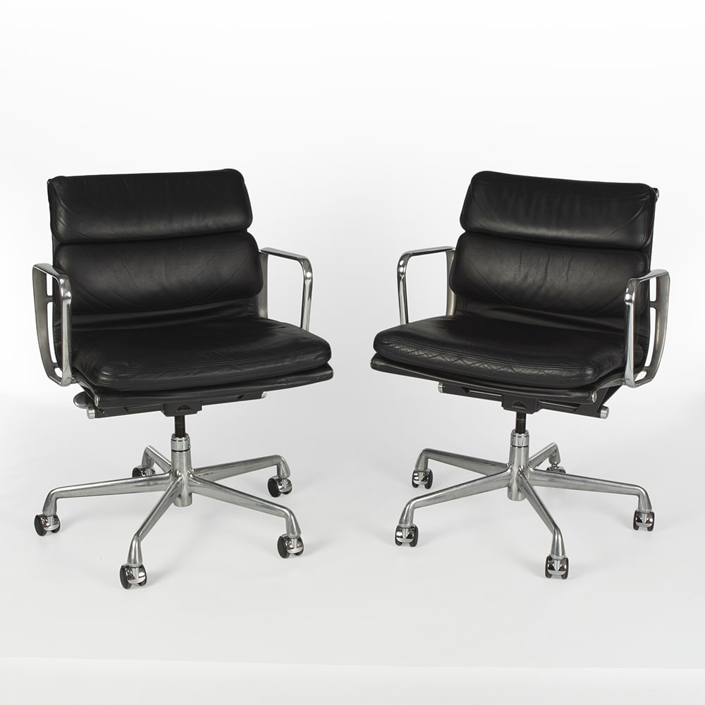 Login to ask a questionThese pair of black original Herman Miller Eames ‘Soft Pad’ EA435 ‘low back’ Aluminium Desk Chairs are fantastic statement pieces and are really comfortable! The perfect home office or office chair, the Eames desk chair has stood as one of the most popular office chairs for nearly 60+ years and it’s easy to see why!