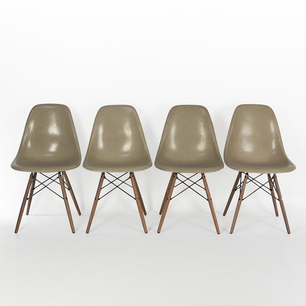 Login to ask a questionSome excellent original, Eames side chairs for Herman Miller look fantastic in light greige and sat upon their flattering, used, newer, walnut DSW dowel bases. Greige side shells are a highly coveted colour for the Eames shell chairs and this version is in excellent vintage condition.
