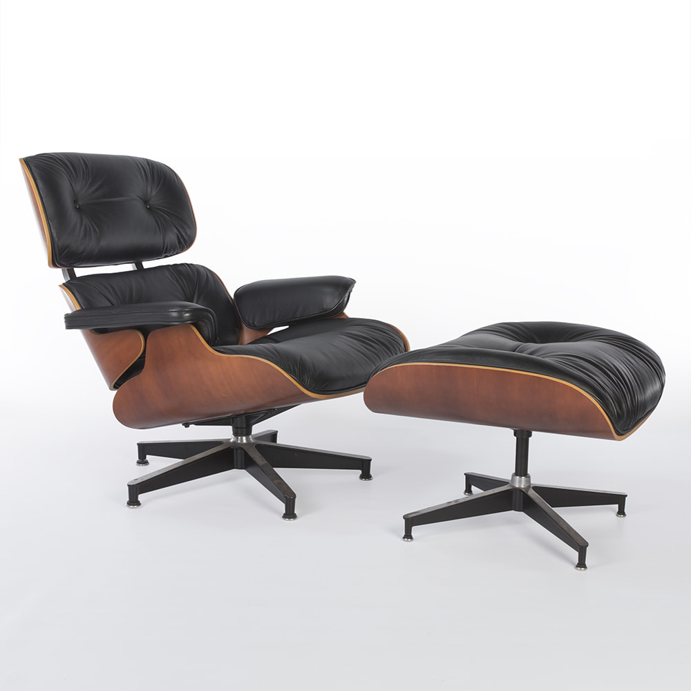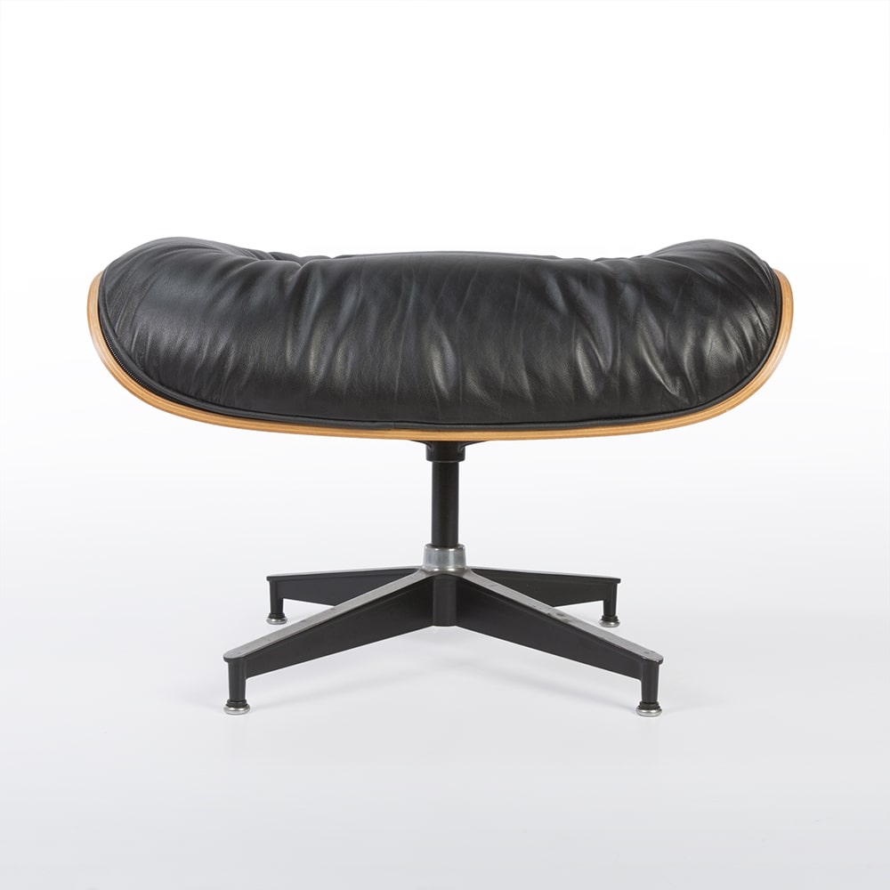 Login to ask a questionA great example of an all original, Herman Miller Eames lounge 670 chair and 671 ottoman finished in superb black leather and light red cherry wood, perfect. The stark black of the well-worn leather is wrapped in the beautiful cherry wood which has aged well creating a truly classic looking chair.
