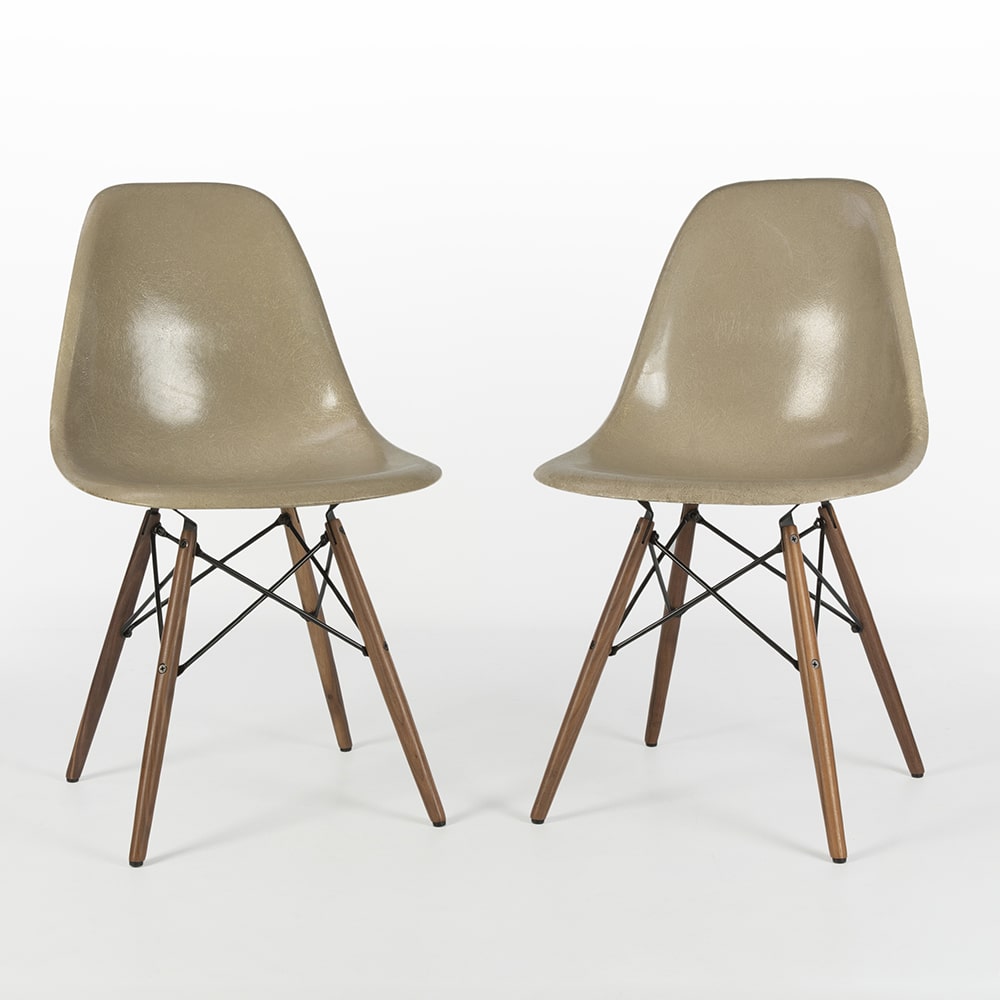 Login to ask a questionA pair of excellent original, Herman Miller Eames side chairs look fantastic in light greige and sat upon their gorgeous, used, newer, walnut DSW dowel bases. Greige side shells are a highly coveted colour for the Eames shell chairs and this version is in excellent vintage condition.