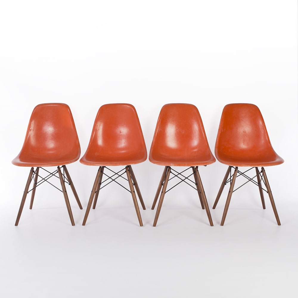 Login to ask a questionSo, you need a dining chair? These original orange Herman Miller Eames fiberglass side shell chairs on their used light oak DSW Dowel bases would be perfect. The orange shells have developed a rather unique patina with fantastic clearly seen visible fibers which are complimented by the golden oak of the DSW bases.
