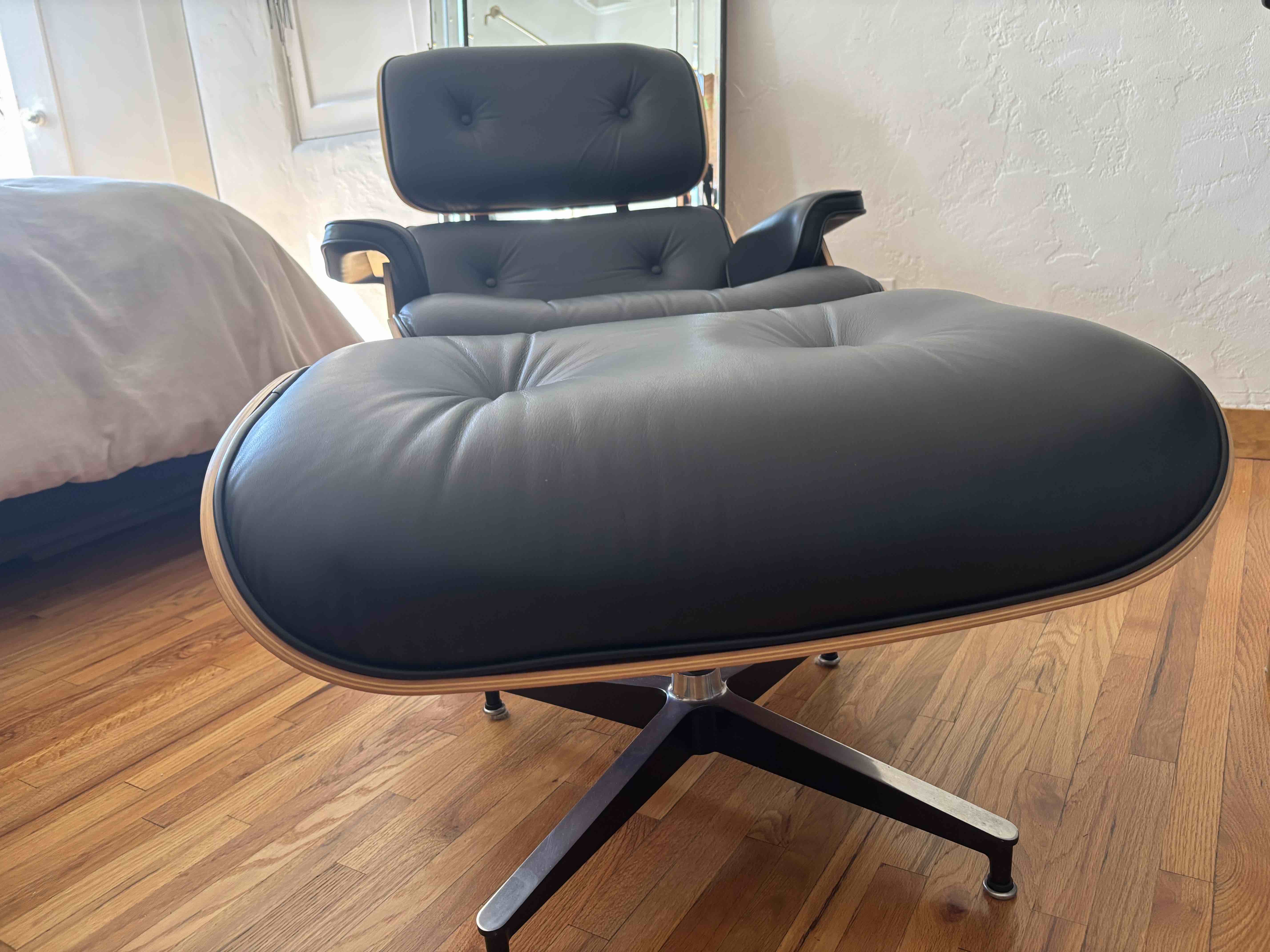 Login to ask a questionHerman Miller Eames Lounge Chair & Ottoman – Black Leather & Walnut – Great Condition. Very little use.