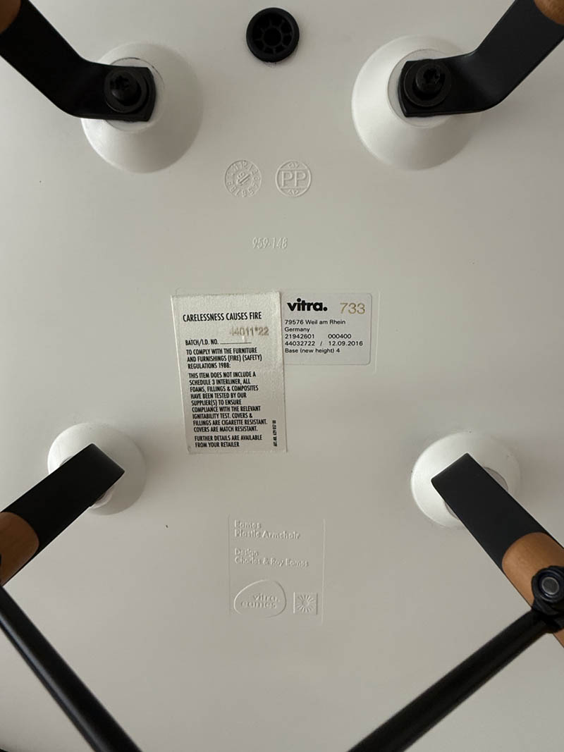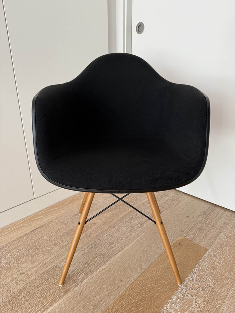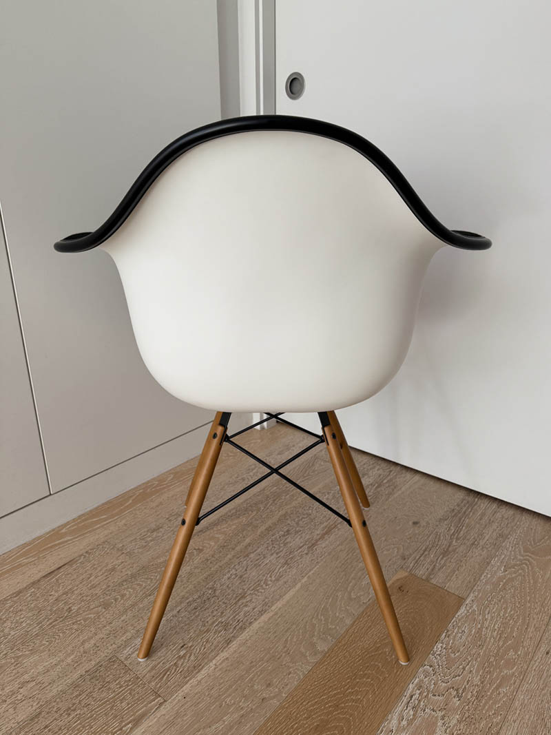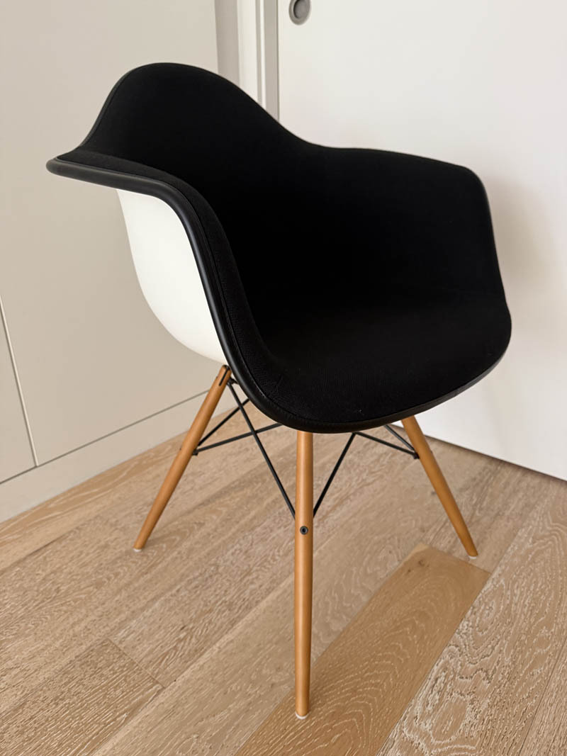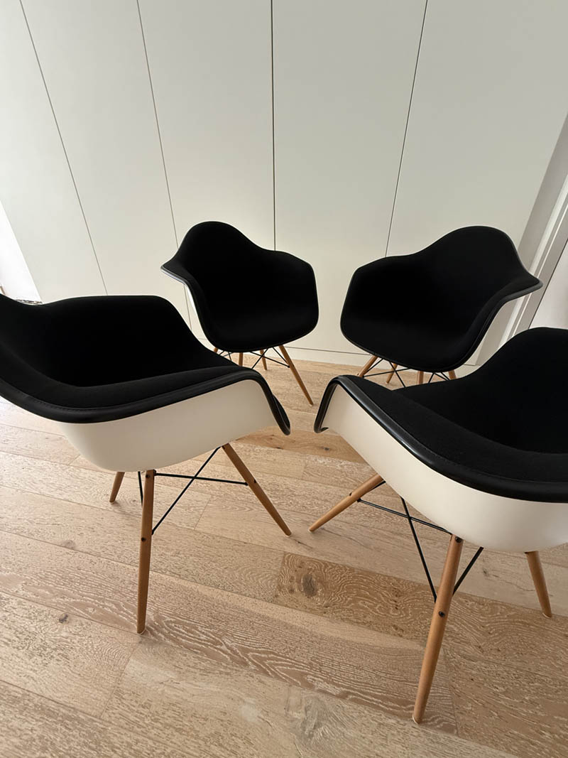 Login to ask a question4 x Vitra Eames DAW Armchairs — white plastic shell, upholstered in black Hopsak, with golden maple legs.