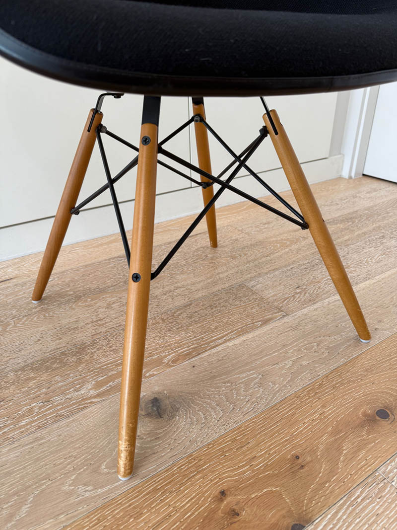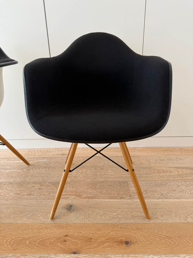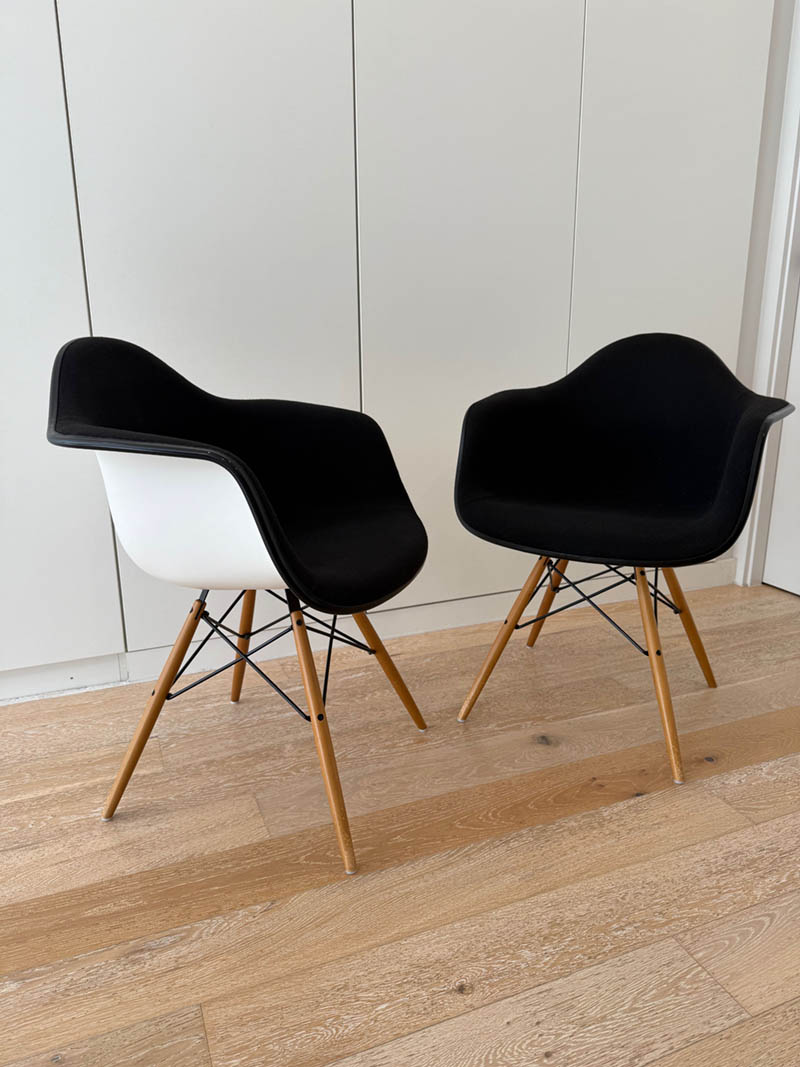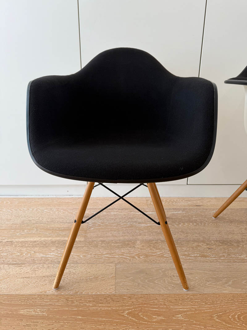 Login to ask a question2 x Eames DAW Armchairs — white plastic shell, upholstered in black Hopsak, with golden maple legs. There is scuffing on the lower part of the legs, as seen in the photos.