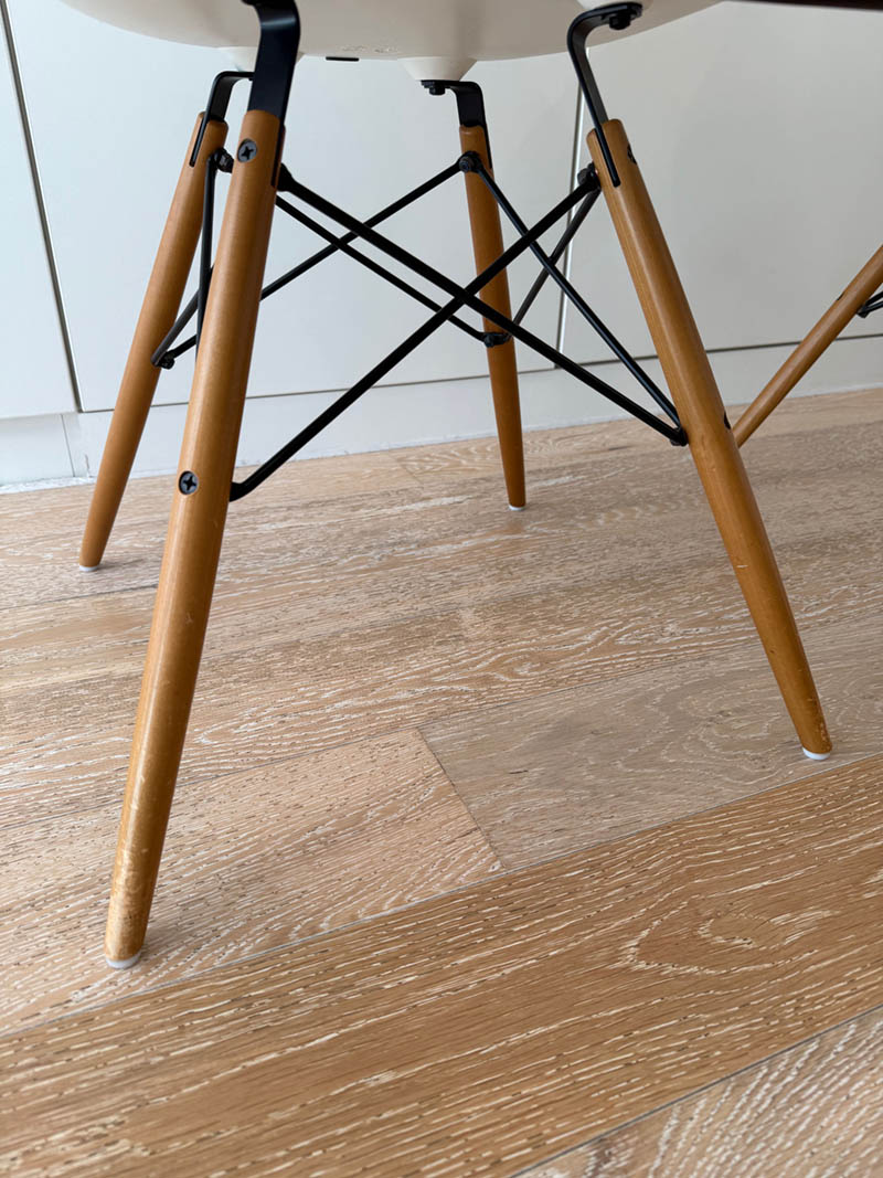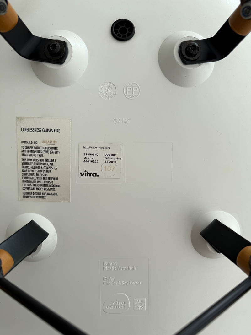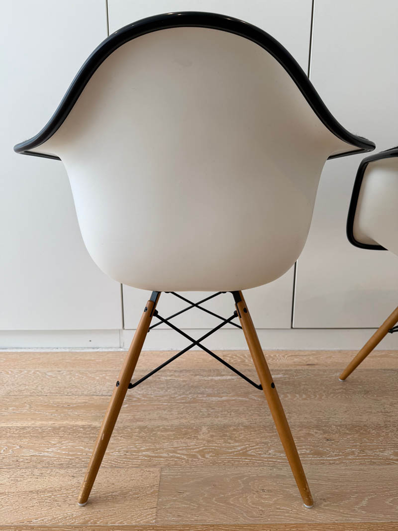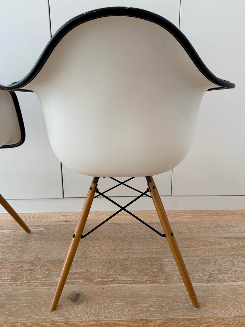 Login to ask a question2 x Eames DAW Armchairs — white plastic shell, upholstered in black Hopsak, with golden maple legs. There is scuffing on the lower part of the legs, as seen in the photos.