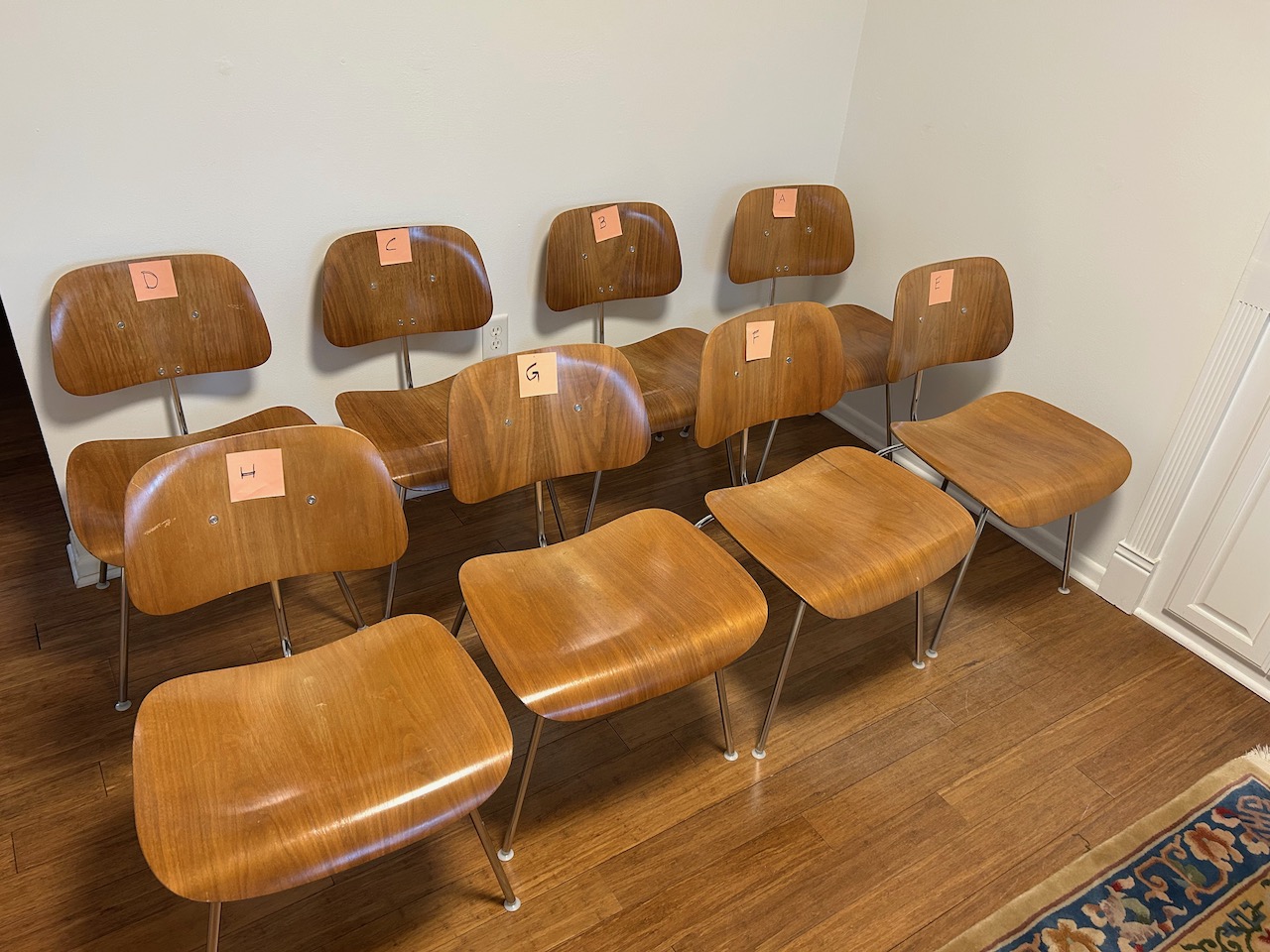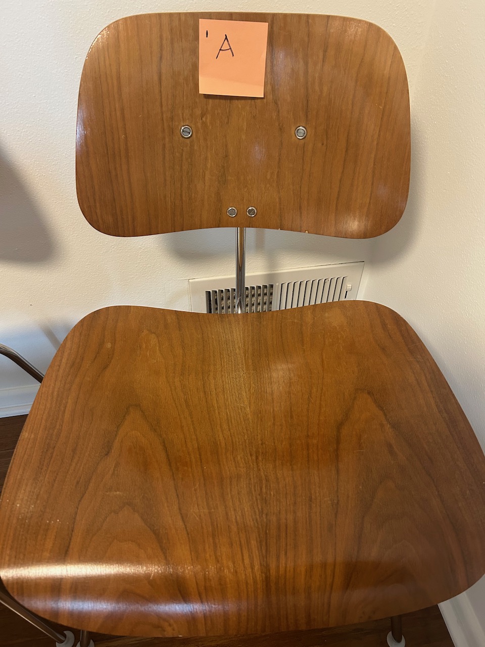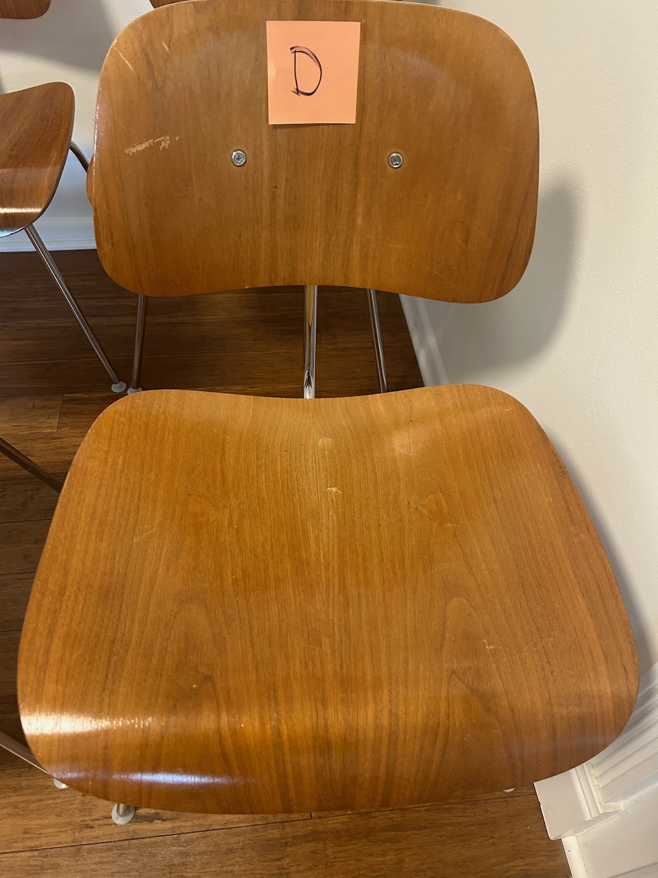 Login to ask a questionThe Chair That’s Smarter Than Your Uncle Bud. Institutionally updated and present for at least 6 PhD's. Lovingly restored. Still cooler than your entire living room. Introducing the Eames Molded Plywood Dining Chair (circa 1946, these are probably closer to the 1960's)—the legendary seat born in a California apartment and raised by design royalty, Charles and Ray Eames. This isn’t just furniture. It’s a mid-century modern icon with curves that say, “I read Bauhaus manifestos for fun.” (discount if you read it and did a dissertation on Bauhaus in German)