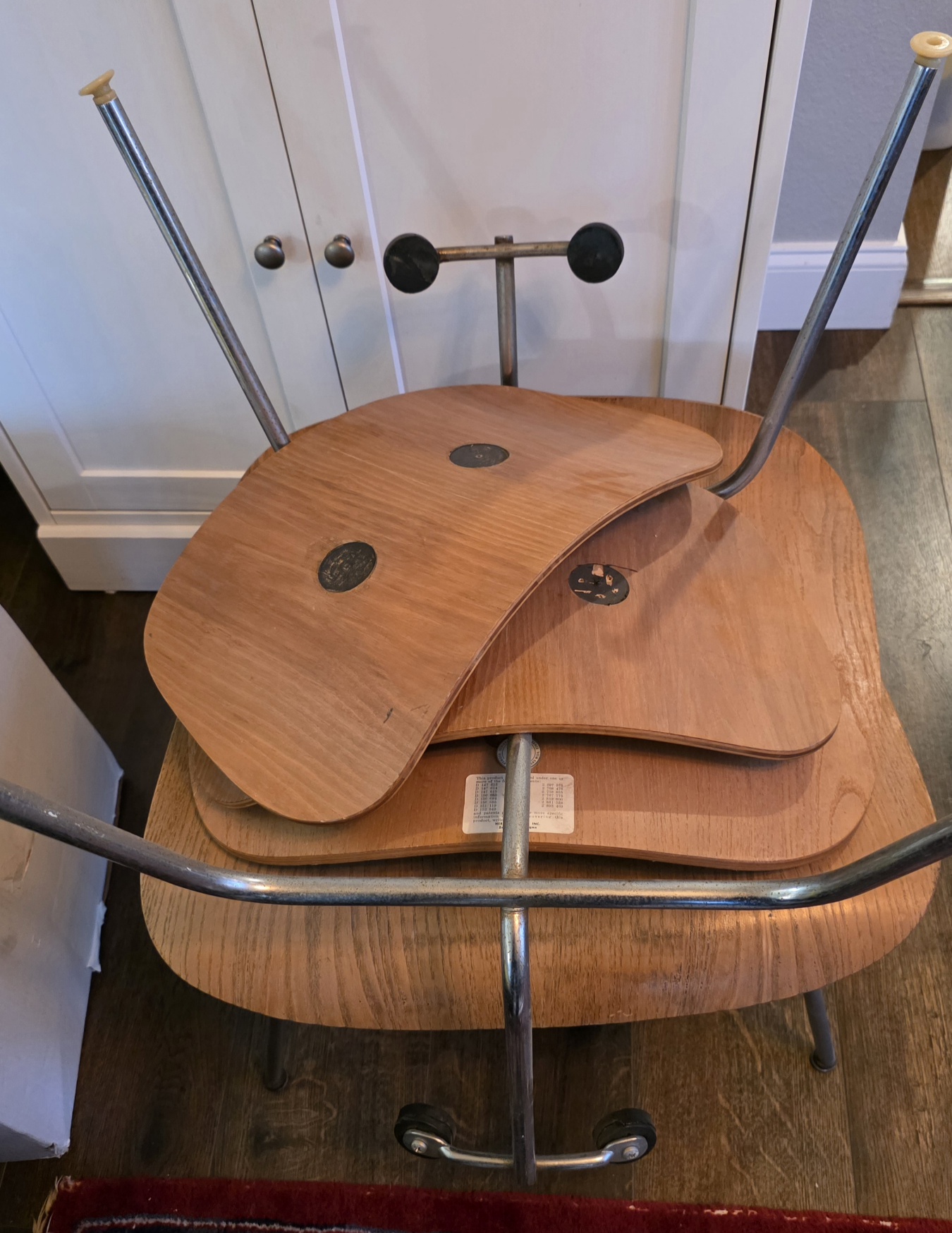 Login to ask a questionMy grandparents bought these chairs and a matching table from a department store in Jackson, Mississippi in 1952 (allegedly). Table is not for sale, but these chairs will need more expertise than I can give to make them functional again.
