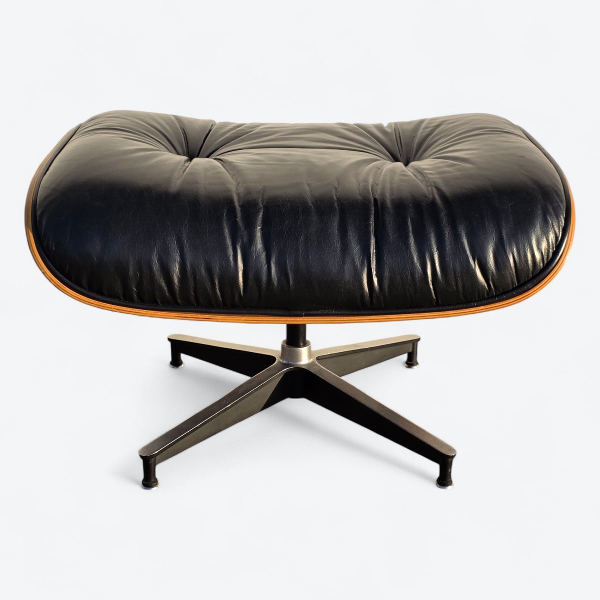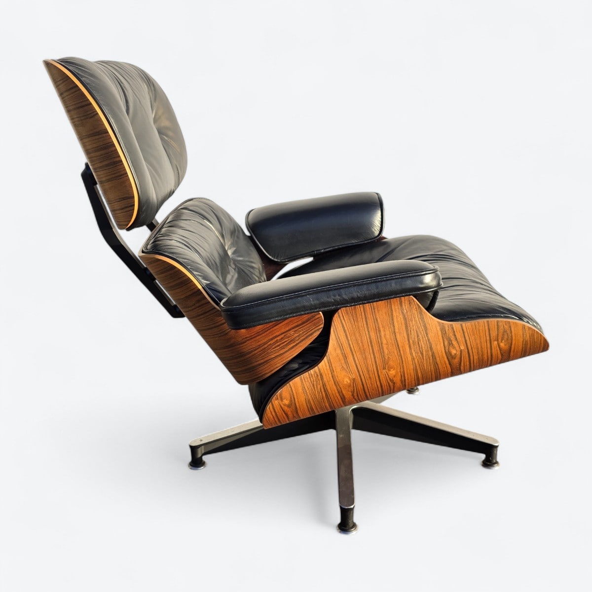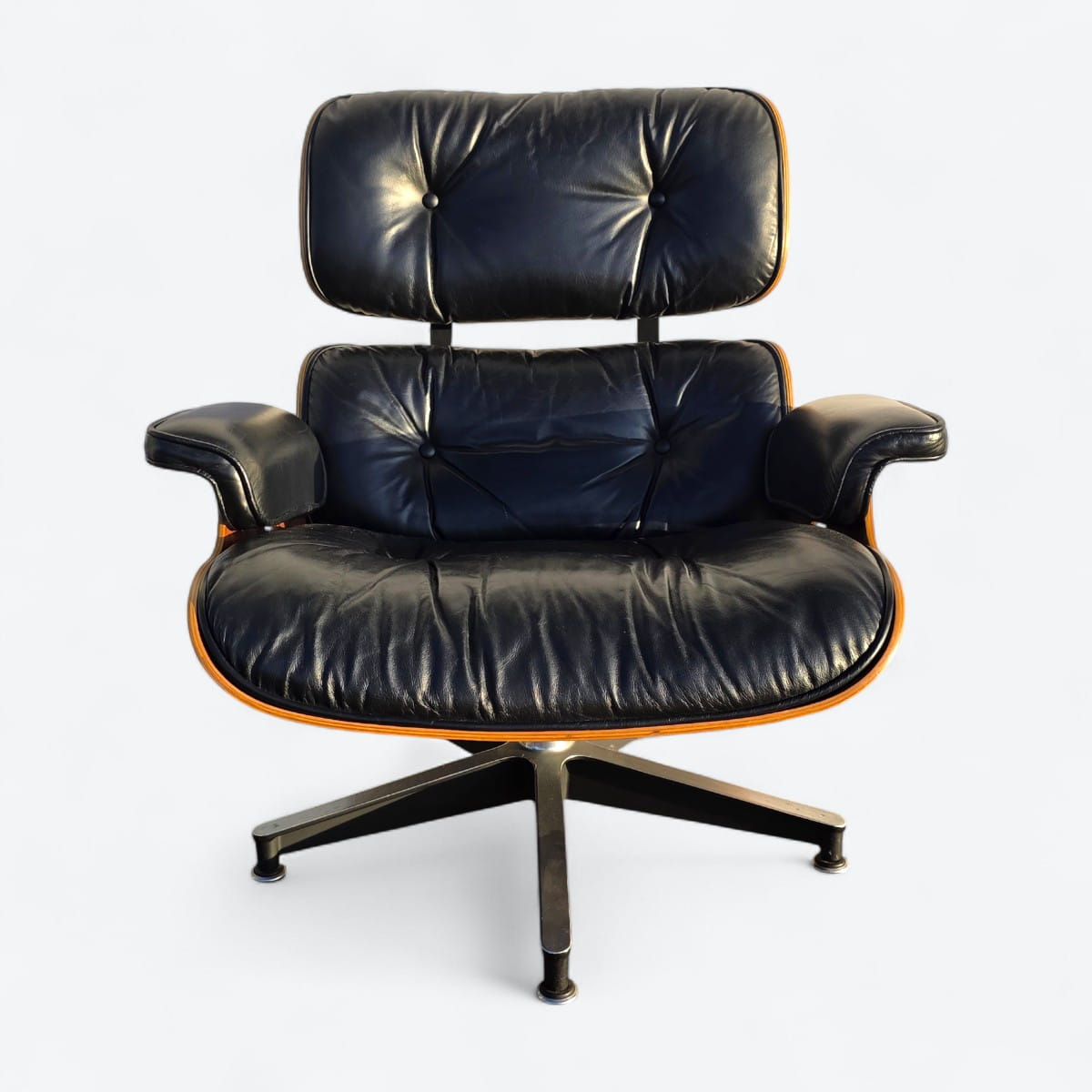 Login to ask a questionThe Eames Lounge Chair and Ottoman as originally offered by Herman Miller. The vintage black leather and rosewood finish is incredible and really is luxurious. Designed to be the perfect lounge chair, it is easy to see why this incredible set has seen continuous production since 1956 due to its style and comfort.