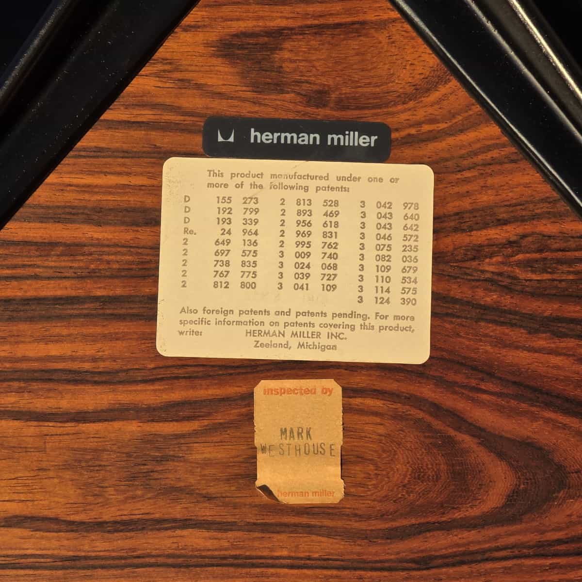 The black label combined with the patent label on the underside narrows the production time frame for this chair to between 1970 and 1978 by Herman Miller.