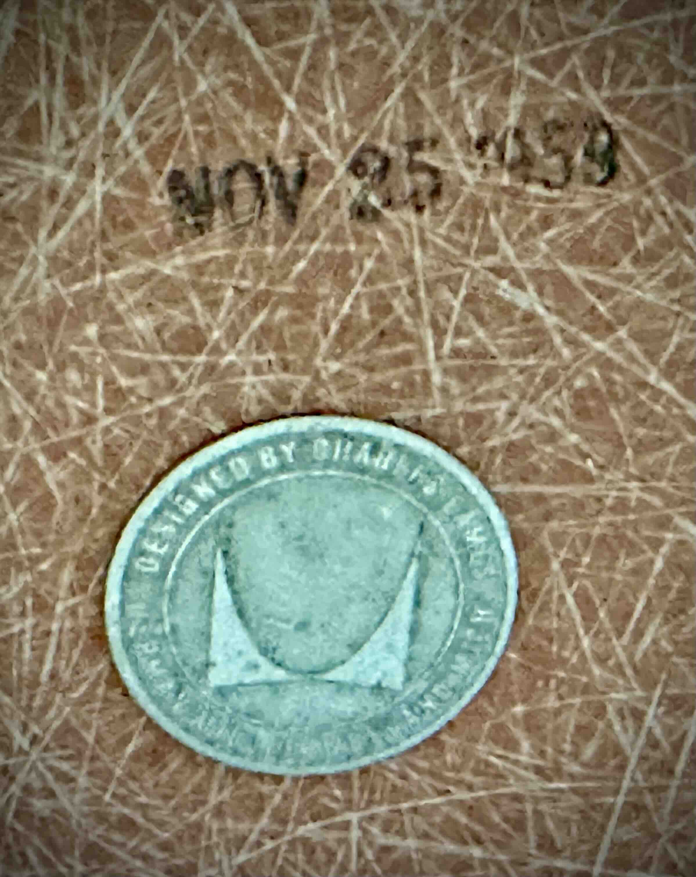 Original Herman Miller Eames fiberglass shell chair medallion and production stamp on bottom of chairs.